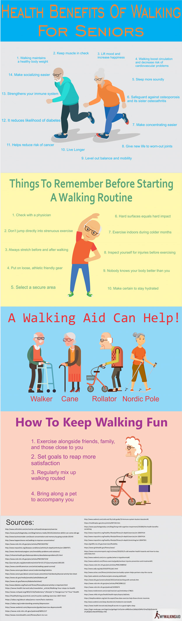 Running and walking have many health benefits. As you get older, your body may not be able to take the stress of running. That doesn’t mean you should give up on exercise altogether. Walking can help seniors keep their muscles in check, improve their mood, and sleep better. This infographic from MyWalkingAid takes a look at health benefits of walking for seniors: