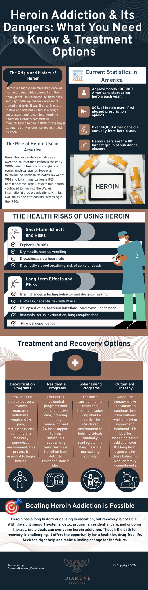Drug addiction is a big issue in this country and many other places around the world. Heroin is particularly addictive and dangerous. It can affect the brain and collapse the veins, leading to infection and cardiovascular damage. This infographic from Diamond Recovery Center covers the dangers of heroin addiction: