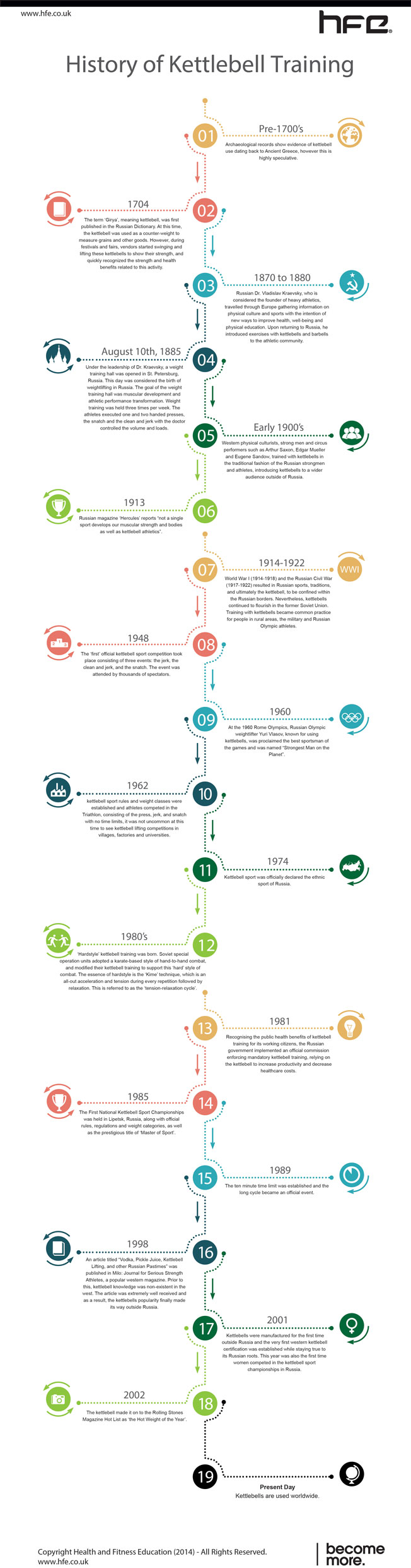 Kettlebells are wonderful tools for strength training and killer fitness routines. Have you ever wondered when people started using kettlebells for fitness training? This infographic from HFE sheds light on that: