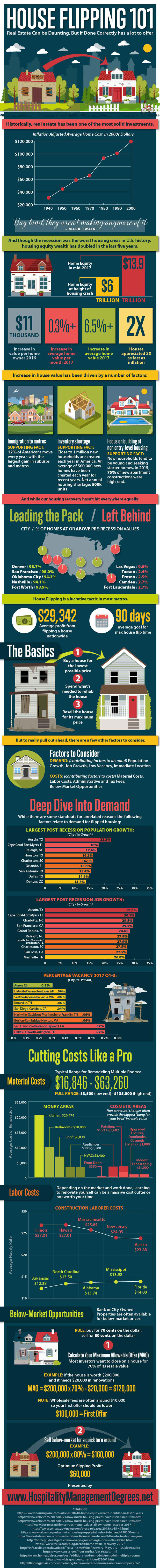 Real estate is a lucrative business to be involved in if you know what you are doing. Plenty of real estate professionals have mastered the art of flipping houses and earned a ton of money in the process. This infographic from HospitalityManagementDegrees takes a look at what it takes to do just that: