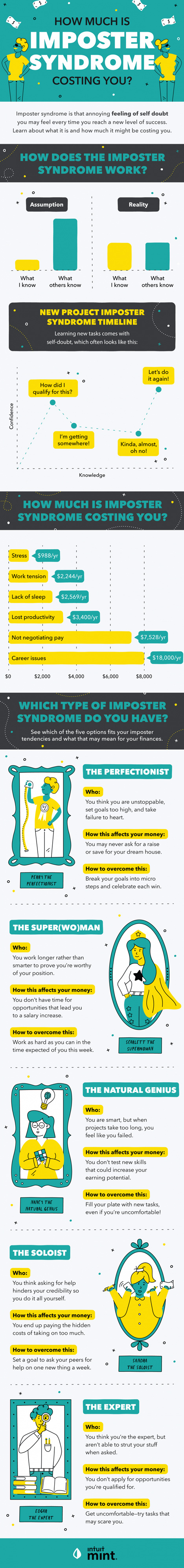 Imposter syndrome is a feeling of self doubt that you feel when you reach a new level of success. It could cost you at home and work. This infographic from Intuit covers how imposter syndrome can cost you money:
