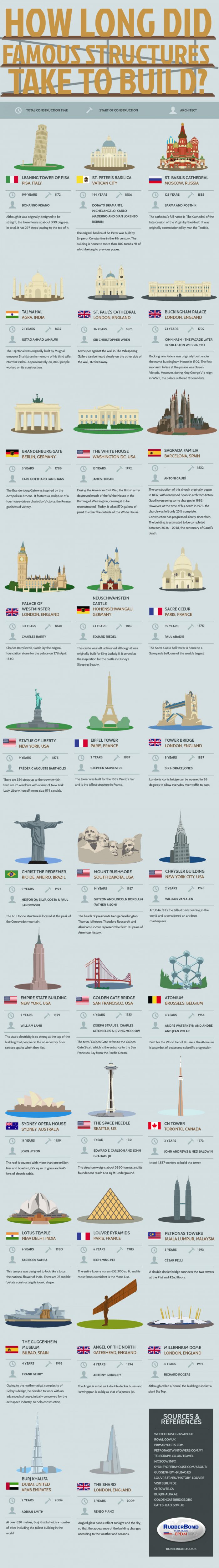 Those of you who travel around the world regularly have probably had the opportunity to see many amazing structures. Have you ever wondered how long it took to build the Taj Mahal, White House, or Eiffel Tower? This infographic from RubberBond takes a look: