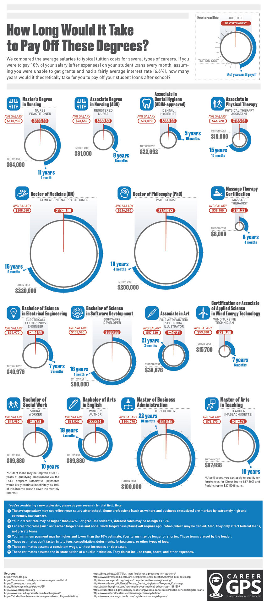 College tuition can be quite expensive. Some degrees cost a lot more than others but lead to better paying jobs. This infographic from Career GPS takes a look at how long it would take to pay off costs of acquiring various college degrees: