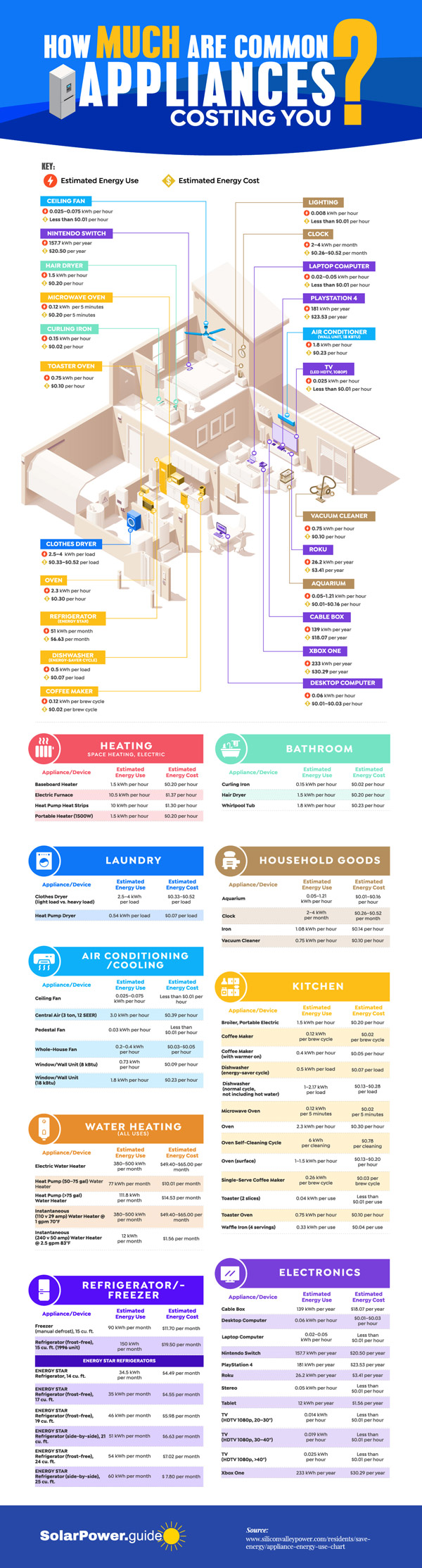 You can’t expect to save money on your electricity bill if you don’t know which appliances are energy hogs. This infographic from SolarPower.Guide shows you how much common appliances cost you: