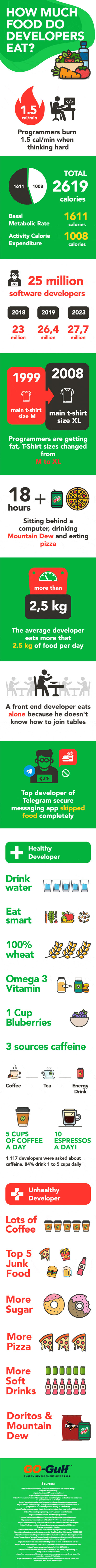 It is no secret that coding takes a lot of brain power, so it is not a surprise that programmers need a lot of food to keep going. This infographic from Go-Gulf takes a look at how much food developers eat: