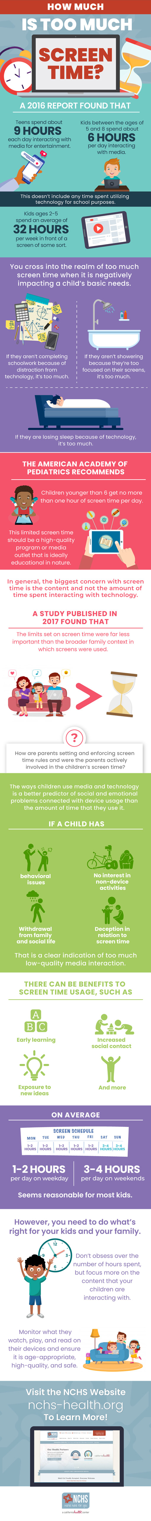Many of us spend way too much time using our smartphone, tablet, or laptop. There is such thing as having too much screen time, especially for kids. This infographic from North County Health Services takes a look at this issue: