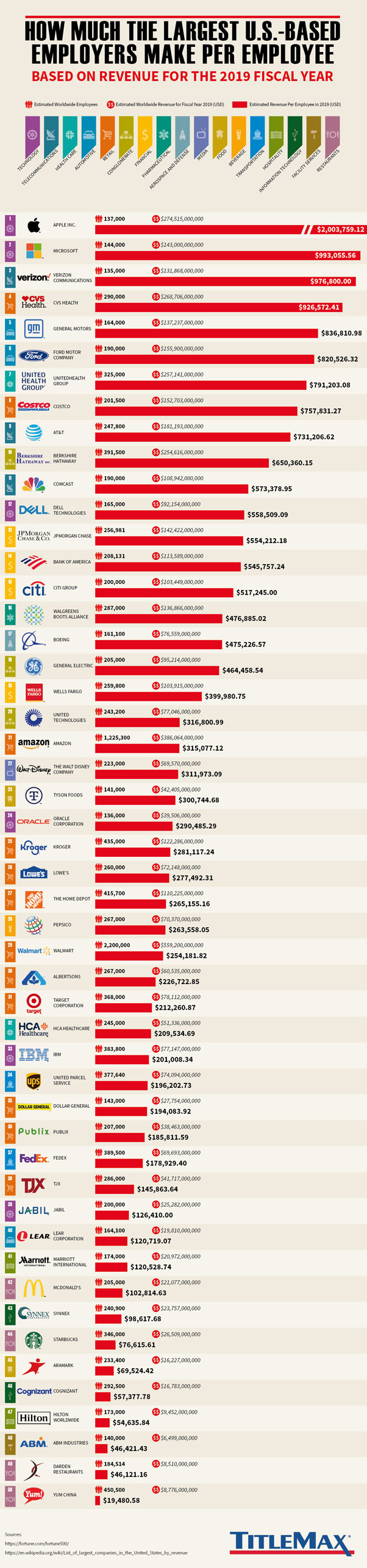 It is no secret that Apple, Microsoft, and Verizon all make a lot of money each year. They do have a lot of employees too. This infographic from TitleMax takes a look at how much large US-based employers make per employee:
