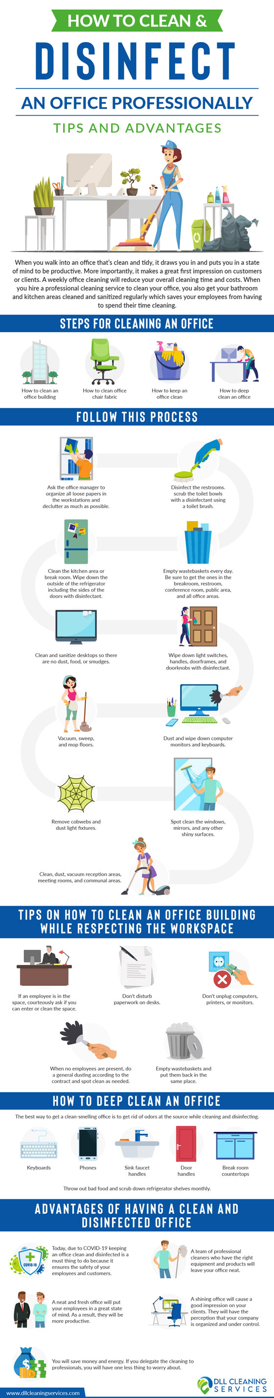 Plenty of businesses are investing money and effort to disinfect their offices and keep their employees and visitors safe against the spread of COVID-19 these days. This infographic from DLL Cleaning Services takes a look at how you can disinfect an office like a pro: