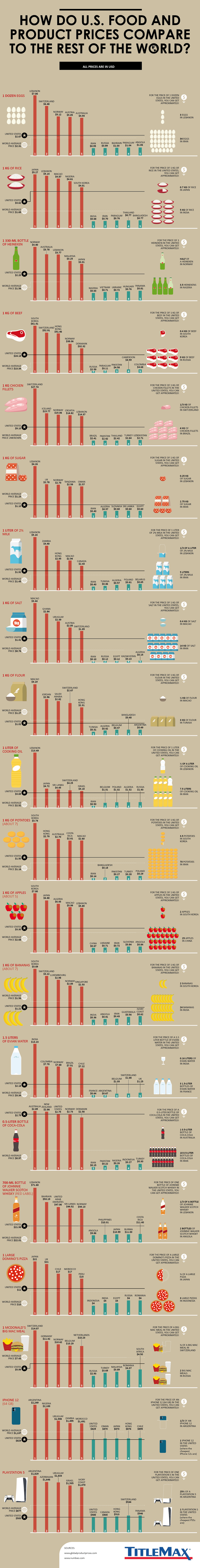 We all know about the issue of high inflation in the US. The cost of living has gone up significantly over the past few years. Have you ever wondered how food and product prices in the US compare to the rest of the world? This infographic from TitleMax takes a look: