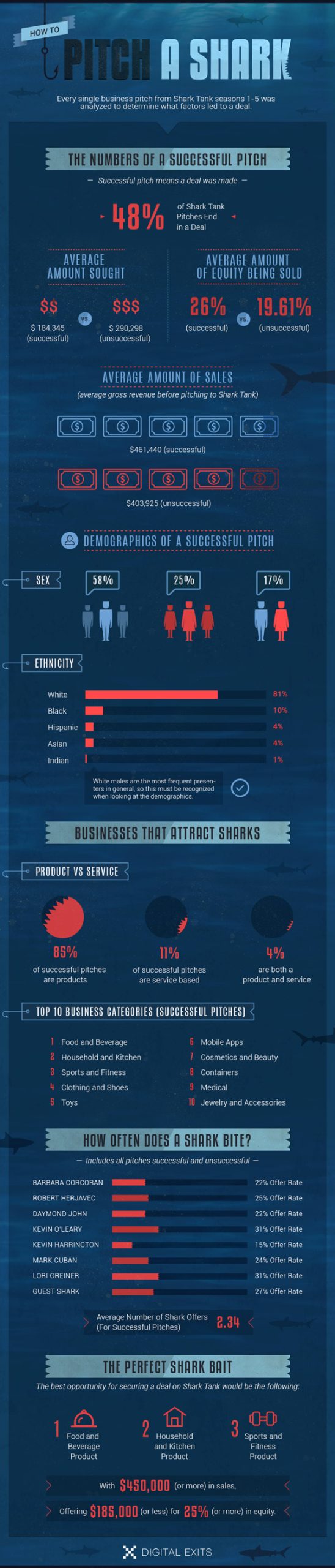 Shark Tank is one of the most popular shows on television. Seeing people follow their dream and getting offered a deal is quite captivating. In order to have success raising funds for your business, you need to get your pitch perfect. This infographic from Digital Exits takes a look at how to pitch a shark: