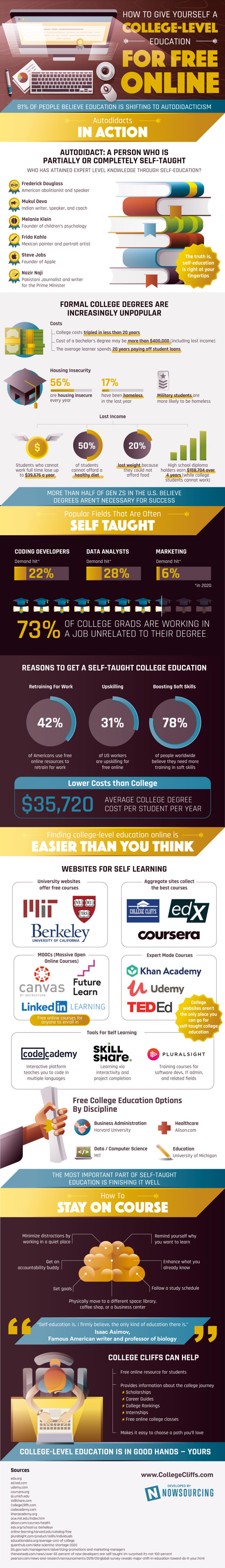 Everyone knows that attending a decent college can cost a lot of money. In this day and age, you can get a college level education for free online. This infographic from College Cliffs shows you how: