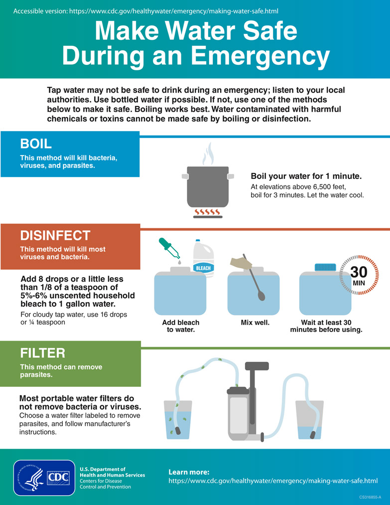 Getting stuck without clean water is not idea. Tap water may not be safe to drink during an emergency. This infographic from CDC takes a look at ways you can make water safe to drink during an emergency: