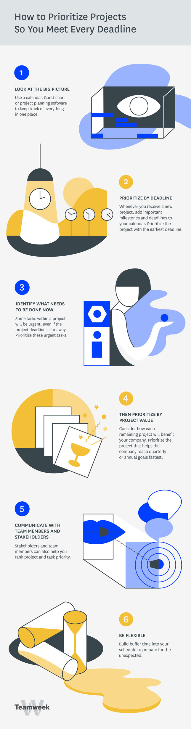 Meeting deadlines is impossible unless you master the art of project management. Tackling multiple projects simultaneously leads to competition for the same resources within your organization. Besides, it could lead to goals and deadlines clashing. This infographic from TeamWeek has a few tips on ways to prioritize projects so you meet every deadline: