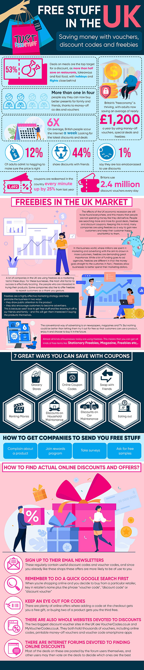 We all would love to save money buying things we need and want. Plenty of companies offer discounts and freebies to new or loyal customers. You will just have to look for them in the right places. This infographic from JustFreeStuff shows you who to save money by using vouchers, freebies, and discount codes: