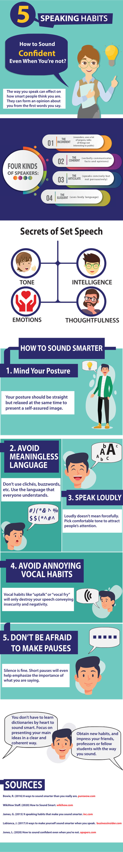 It is no secret acting and speaking confident can get you ahead in life. That specially applies to public speakers. This infographic from APapers covers speaking habits that help you sound more confident: