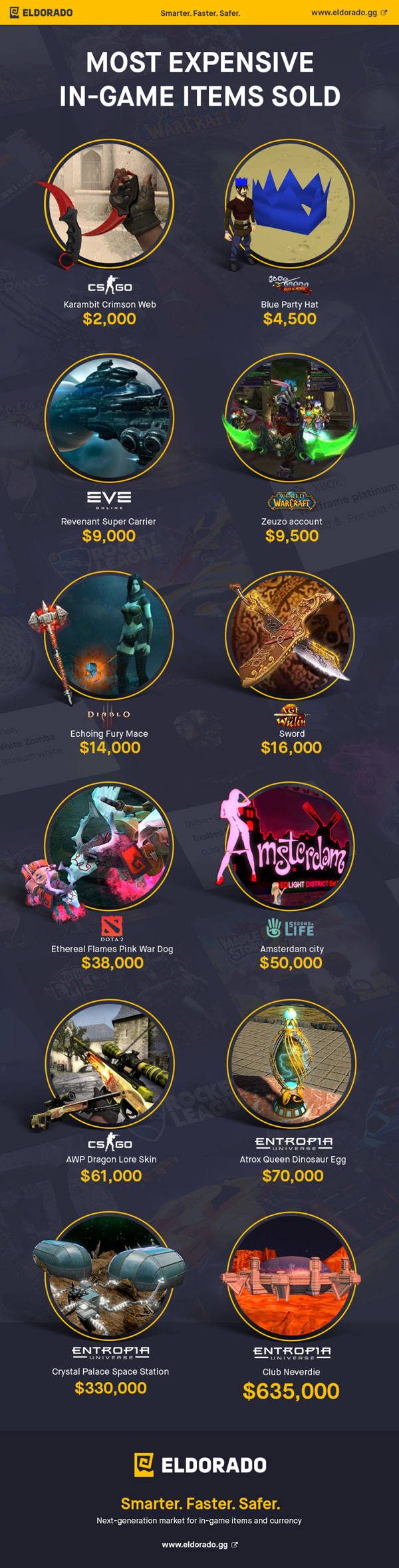 Most serious gamers are familiar with all kinds of goodies and currencies that can be bought in certain games. Certain unique in-game items can cost a fortune though. This infographic form Eldorado takes a look at the most expensive in-game items sold: