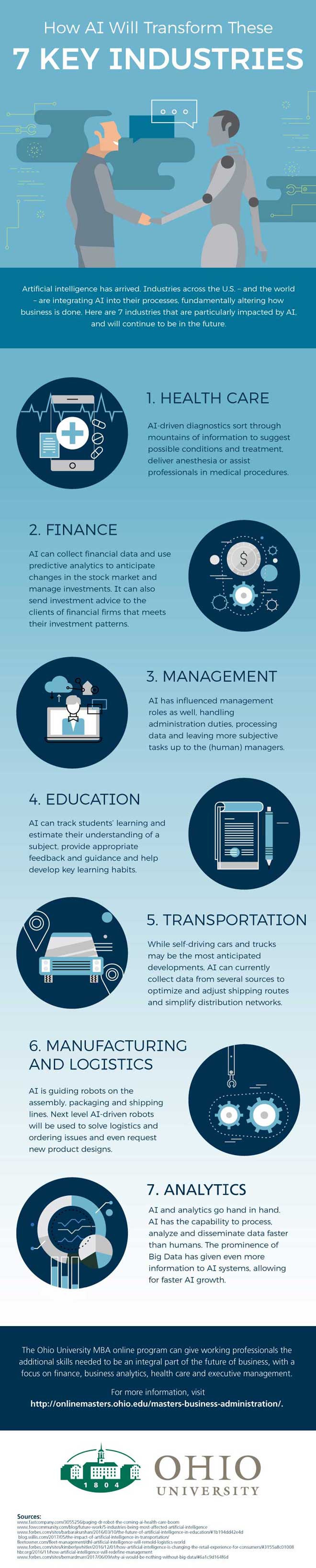 Robots and AI are going to revolutionize many industries, helping businesses deliver more value to their customers. This infographic from Ohio University takes a look at a few industries impacted by AI: