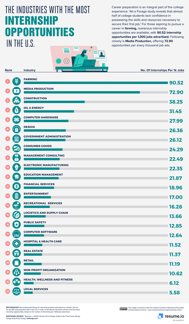 In order to get a job in the corporate world, you are going to need some experience to get your foot at the door. Internships provide college students with the opportunity to prepare for their future career. This infographic from Resume.io covers industries that offer most internship opportunities: