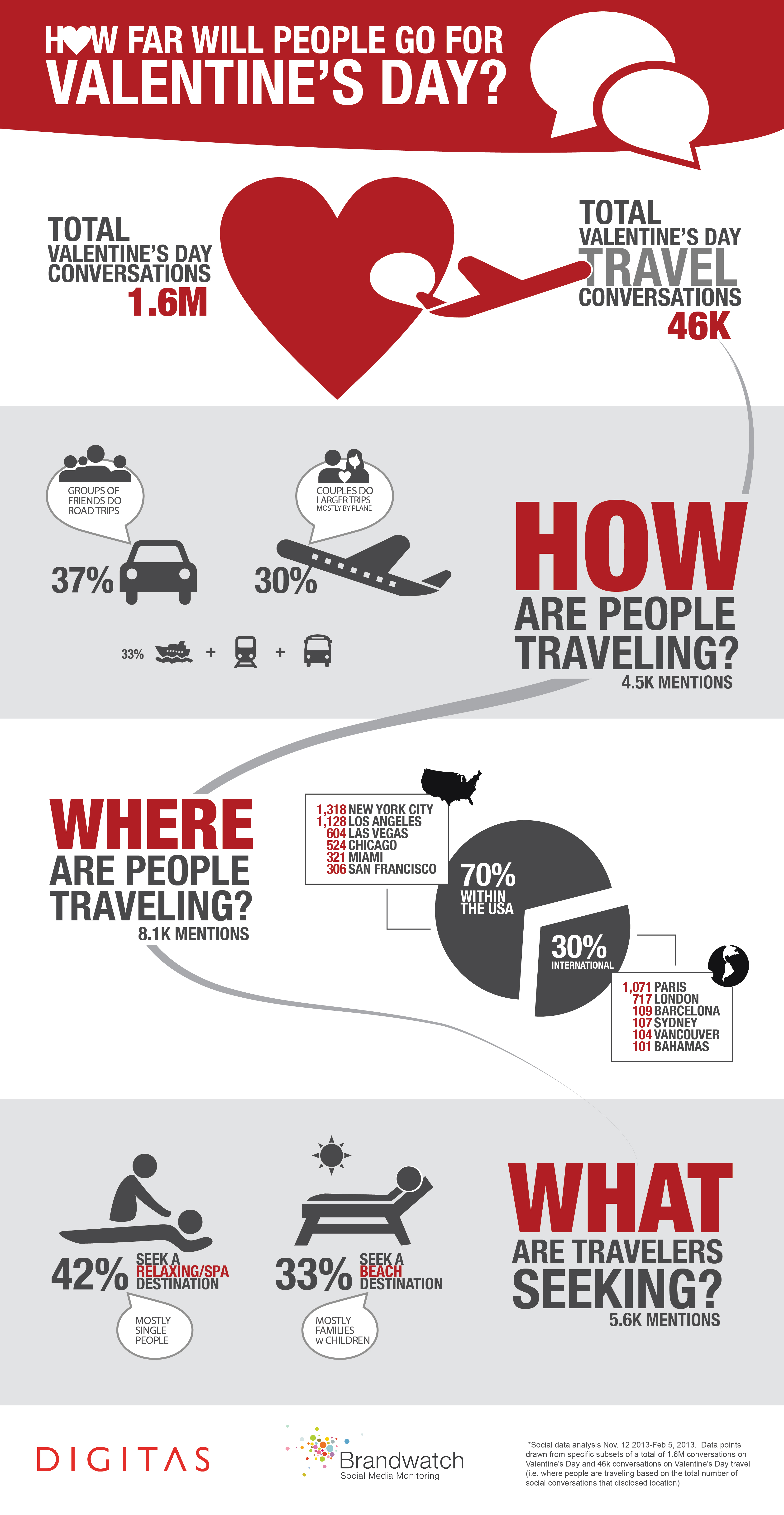 Valentine’s Day is a pretty special day, especially for couples. Many folks take trips for this day to spend time with their loved ones. Beach and relaxing destinations are what people think of when taking trips for Valentine’s Day. The good folks at Digitas and Branwatch have put together an infographic that shows how far people go for this special day:
