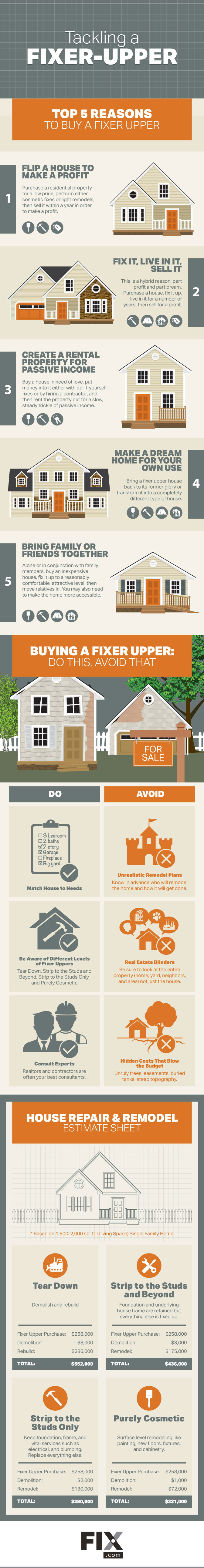 Buying a fixer-upper house for profit or living requires proper planning or you could end up losing your shirt. This infographic from Fix.com covers how you should approach it: