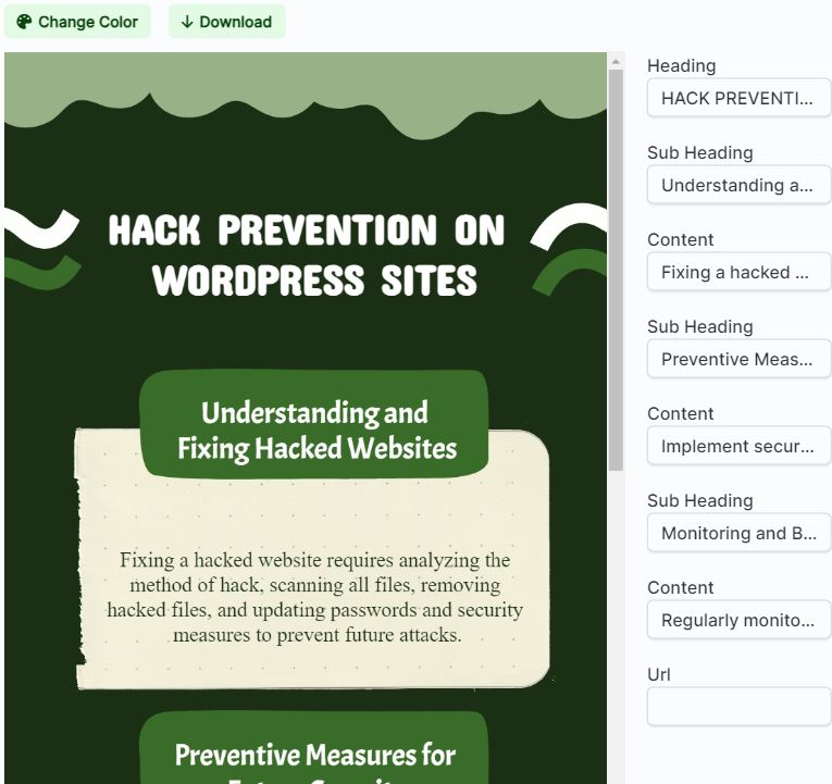 Once your infographic is created, you can change ending, subheading, and content. You can also change colors. You can try this tool for free or upgrade for more infographics.