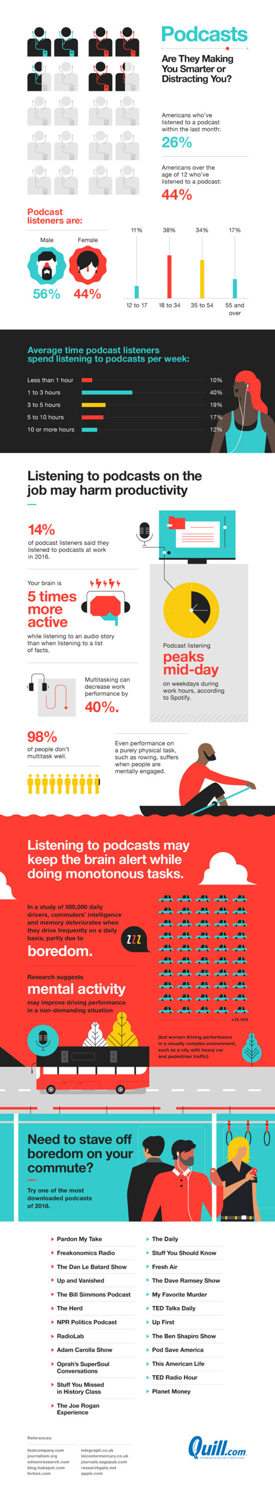 Many of us listen to radio programs and podcasts throughout the day while working. Listening to podcasts can keep the brain alert while doing monotonous tasks but too much of it can harm productivity. Quill.com has shared an infographic that takes a look at this issue: