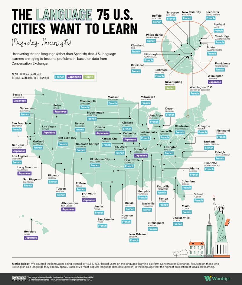 A lot of Americans would love to learn a new language. It is not only a great way to keep your brain sharp but can open new doors of opportunity. This infographic from Word.Tips covers the languages 75 US cities want to learn:
