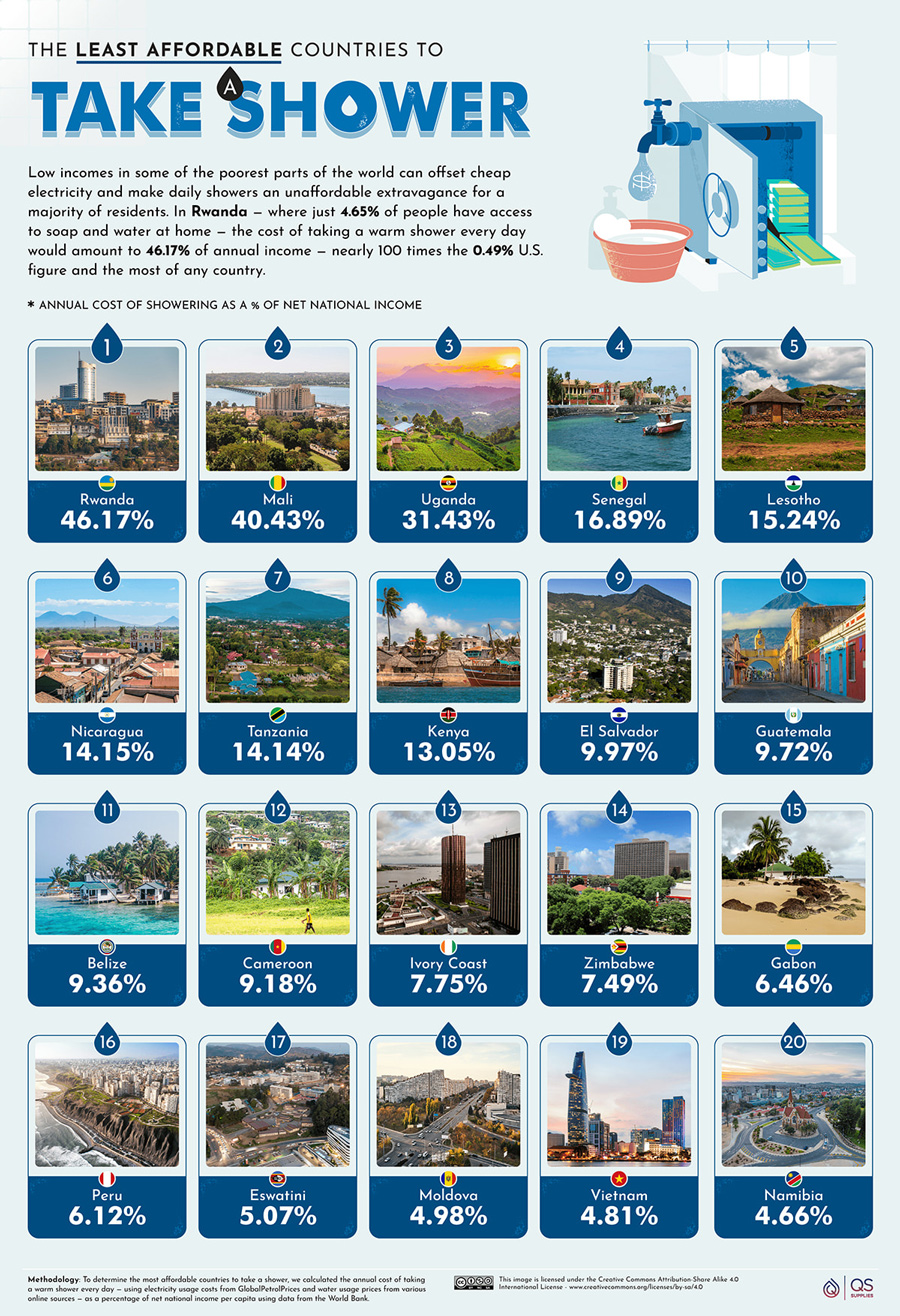 We all take a shower or two every day without even thinking about it. In many other countries, it can be quite expensive to do so. This infographic from QS Supplies covers the least affordable countries to take a shower: