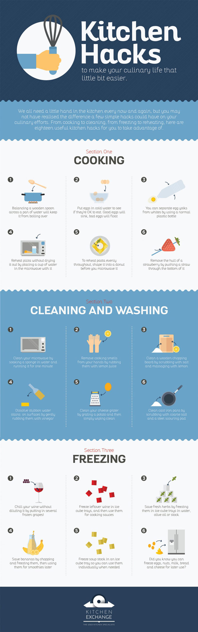 So you spend lots of time in the kitchen? Learning a few cooking, cleaning and washing hacks can always make your culinary life easier. This infographic from Kitchen Exchange covers a few of them: