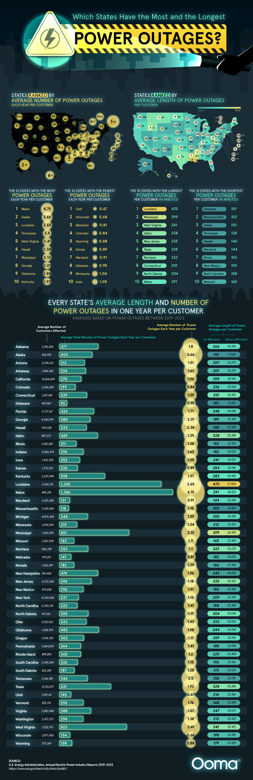Dealing with outages is not fun. In fact, many of us live in areas that don’t get many of them. This infographic from Ooma takes a look at states that have the most and longest power outages: