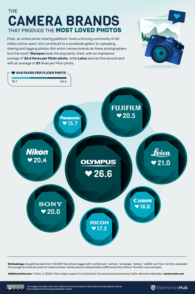 It is no secret that plenty of professional photographers rely on Nikon, Canon, and other expensive cameras to capture amazing videos. Have you ever wondered which camera brands produce the most loved photos? This infographic from ElectronicsHub takes a look: