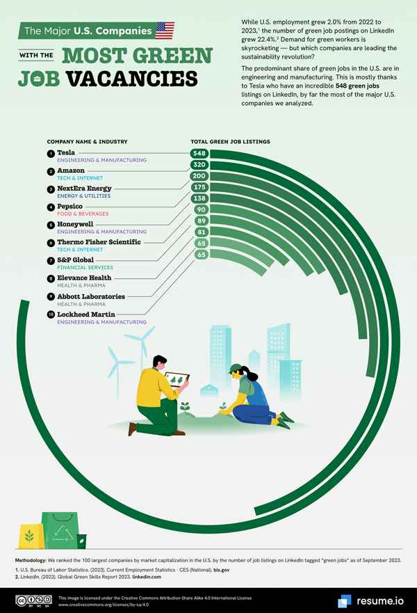 Plenty of companies have invested a lot of money to become more sustainable. We are going to have plenty of more green jobs in the future. This infographic from Resume.io covers the major US companies with the most green job vacancies: