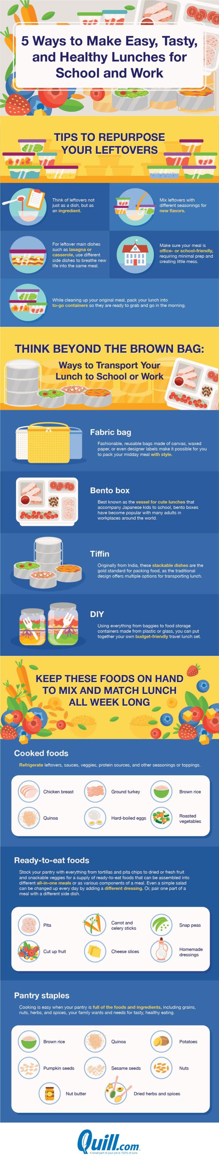 What you put your body affects your health. Making tasty healthy lunches for school and work doesn’t have to be time-consuming. This infographic from Quill gives you a few ideas: