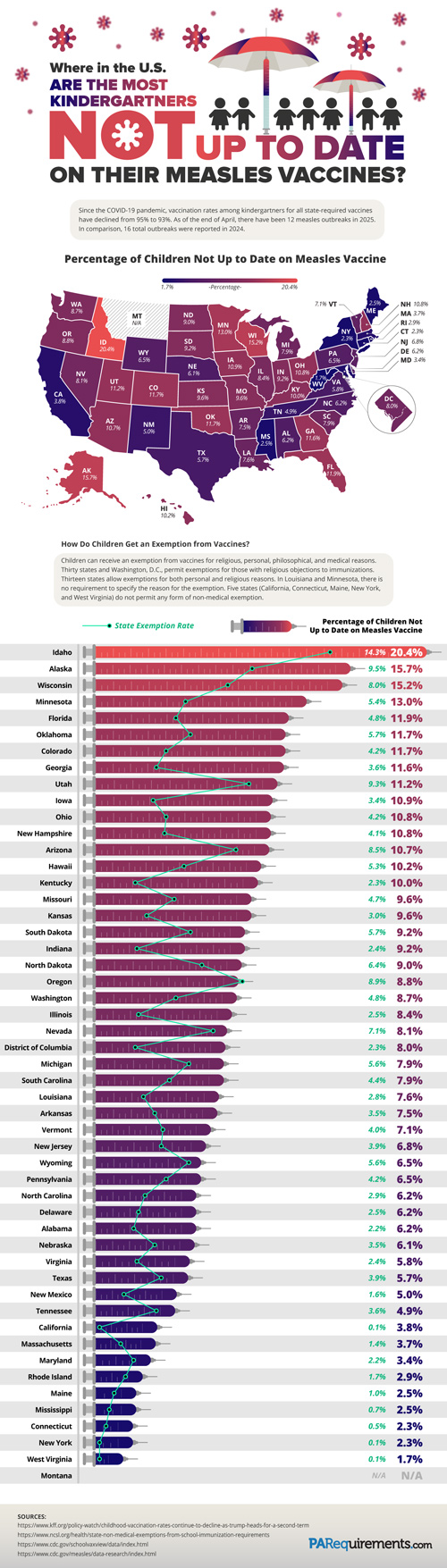 Measles is a highly contagious respiratory disease that can result in severe complications. Getting vaccinated is the best way to keep it under control. Unfortunately, not all kindergarteners are up to date on their vaccines. This infographic from PARequirements visualizes this issue: