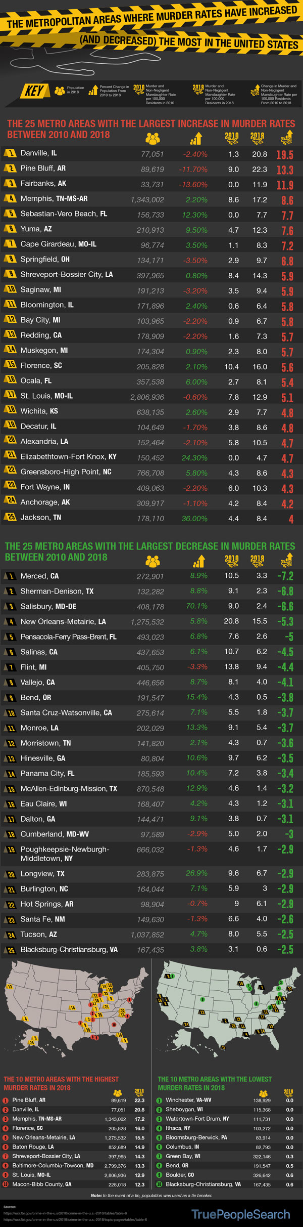 We all would love to live in a safe community. Many metropolitan areas in the U.S. have seen an increase in murder rates. This infographic from TruePeopleSearch takes a look the metropolitan areas where murder rates have increased or decreased the most in the U.S: