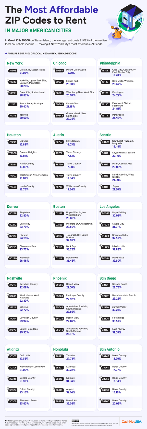 Rent is quite high in many major cities. There are still neighborhoods that allow people with less disposable income to rent a place. This infographic from CashNetUSA covers the most affordable zip codes to rent in many major cities: