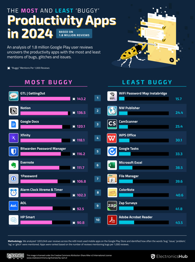 In order to get more things done on a daily basis, you will need the right productivity tools. Unfortunately, a lot of productivity apps are quite buggy. This infographic from ElectronicHub covers the most and least buggy apps: