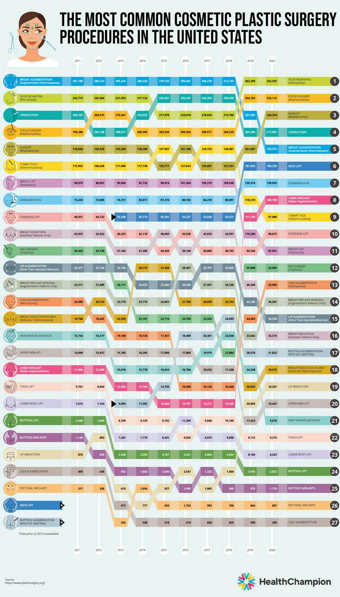 It is no secret that cosmetic plastic surgery is quite popular in the US. Facelifts, liposuction, nose reshaping, and breast lists are just a few common procedures. This infographic from HealthChampion covers the most common cosmetic plastic surgeries in the US: