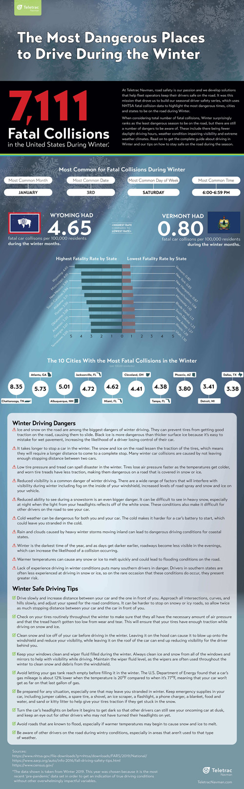 It is no surprise that winter driving is more challenging. You need to be a lot more careful driving in snowy and icy conditions. Your car will take longer to stop in winter. Let’s not forget that low tire pressure and tread can lead to more dangerous driving conditions. This infographic from Teletrac Navman takes a look at the most dangerous places to drive during winter: