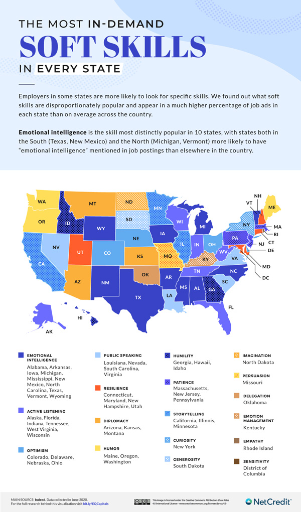 Public speaking, storytelling, and active listening are just a few soft skills that employers are looking for in job candidates. Have you ever wondered which soft skills are in demand in your state? This infographic from NetCredit takes a look: