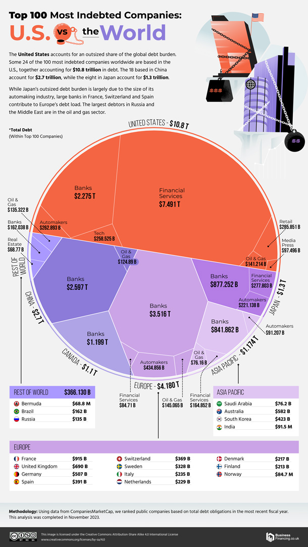 It is no secret that a lot of companies carry and manage a lot of debt. The US accounts have an outsized share of the global debt load. In fact, 24 of the 100 most indebted companies are in America. This infographic from Business Financing takes a closer look: