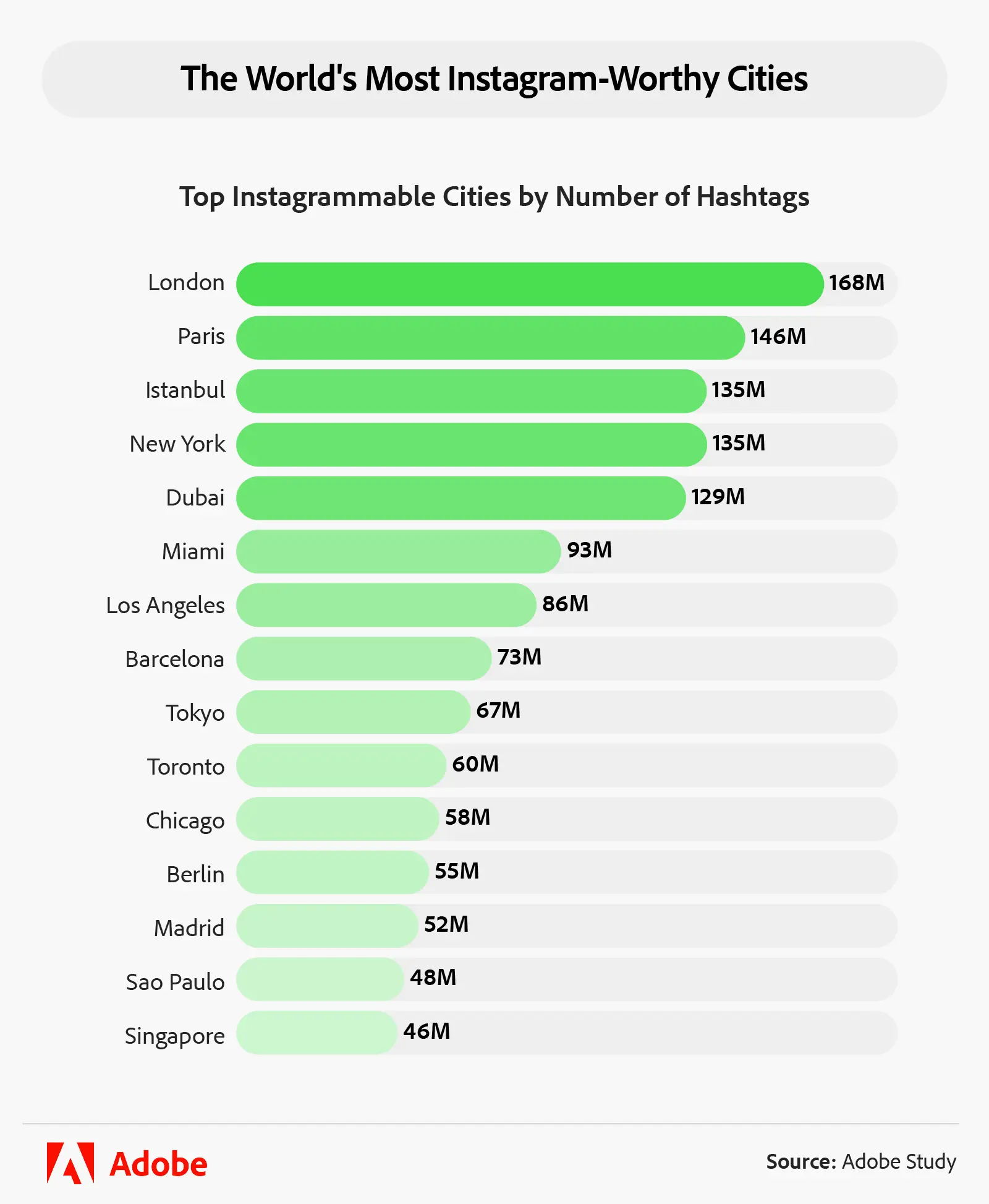 Not every social network is the same, so you will have to adapt your content to each to have success. When it comes to Instagram, living in the right city can help. This infographic from Adobe covers the most Instagrammable cities by hashtags: