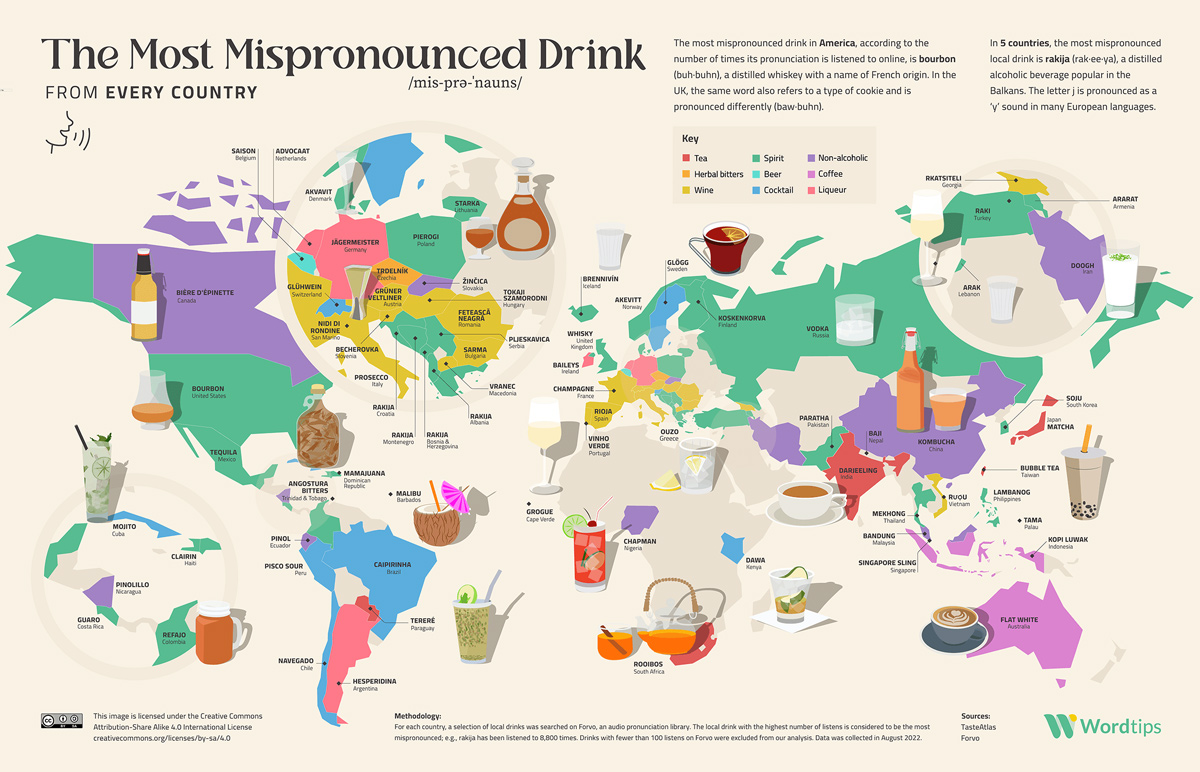 As you travel around the world, you are going to find amazing new drinks to try. Unfortunately, it is not always easy to pronounce their names. This infographic from Word.tips covers the most mispronounced drinks from every country: