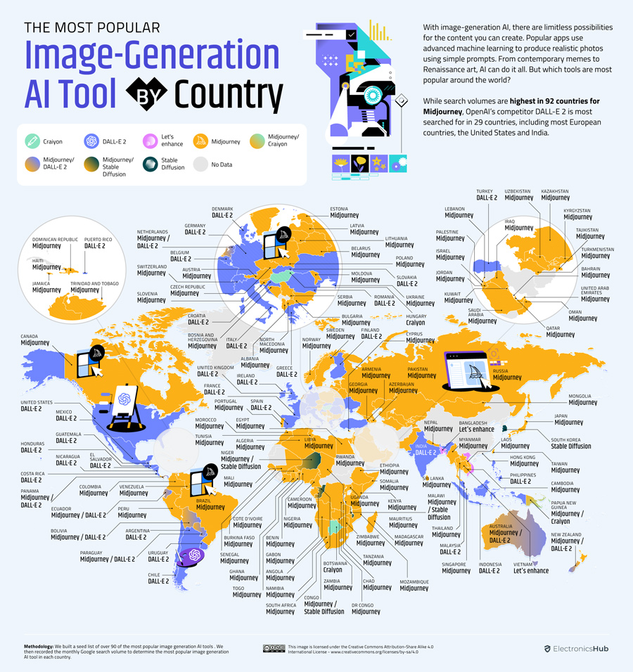 Many of us have used Midjourney and DALL.E for image generation in the past. They are both incredible in their own way. Have you ever wondered which one is more popular around the world. This infographic from ElectronicHubs covers that: