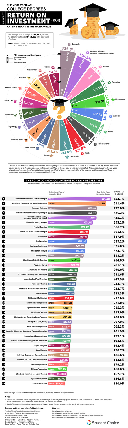 Plenty of people go to college to earn a degree to earn more money. Not every degree gives you a great return on investment. Student Choice has put together an infographic that visualizes the most popular college degrees and their ROI: