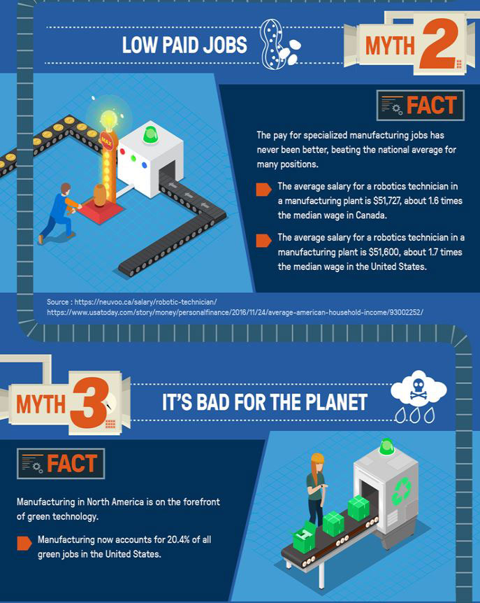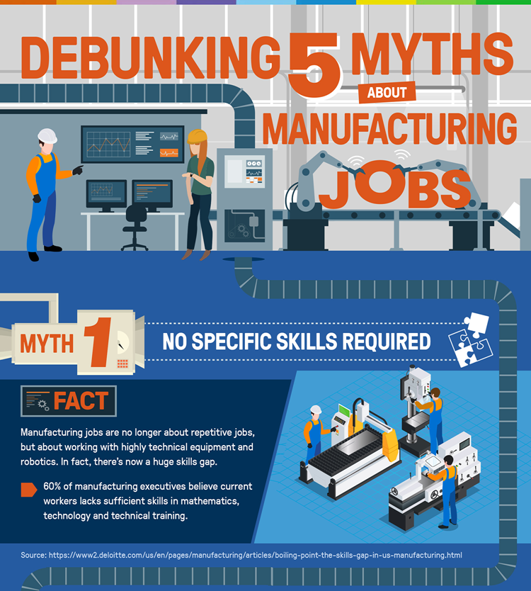 When it comes to manufacturing jobs, there are many myths going about. It is easy to assume that these jobs don’t require specific skills or don’t pay well. This infographic from George Brown College’s PLC Technician Training program debunks 5 myths about manufacturing jobs: