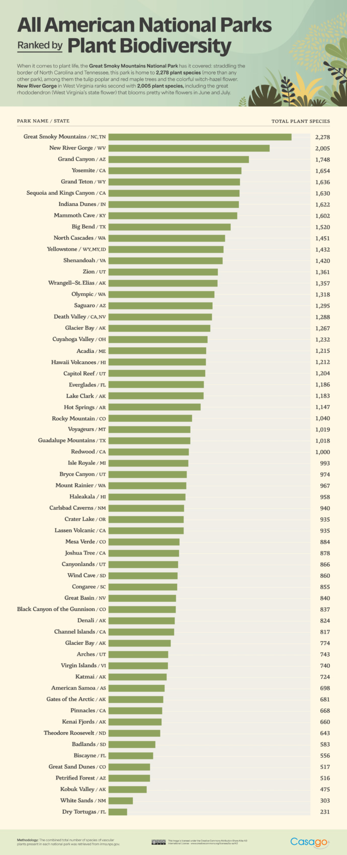 It is no secret that United States has plenty of gorgeous national parks, many of them with a great number of animal and plant species. This infographic from Casago ranks America’s national parks based on plant biodiversity: