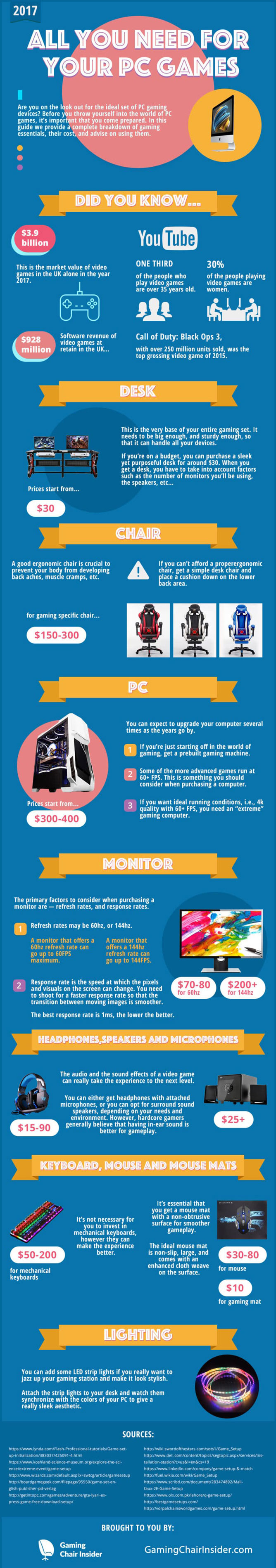You don’t necessarily have to spend a fortune for a gaming setup, but you will need a decent computer, chair, desk, and a few other things. This infographic from GamingChairInsider covers a few things you will need for gaming: