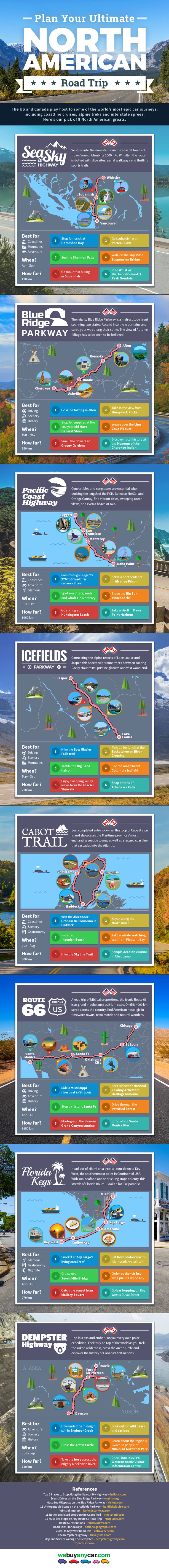 There are plenty of amazing places to visit in the U.S. and Canada. To get the most out of your road trips, you will have to do your homework and plan ahead of time. This infographic from WeBuyAnyCar covers a few fun North American road trips you shouldn’t miss: