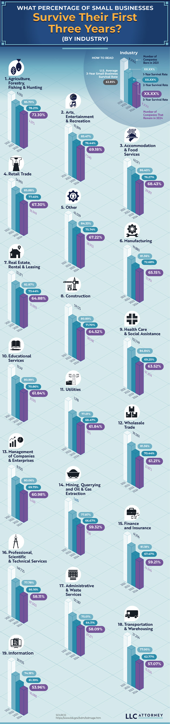 Starting a business comes with its own challenges. Keeping it going is even more difficult. A lot of businesses fail in their early years. This infographic from LLC Attorney covers the % of small businesses that survive their first 3 years: